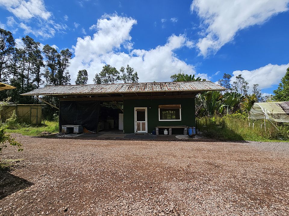 Main Building is permitted as an Ag Shed and is connected to HELCO. Building is approx 400 sq ft with an additional 400 sq ft. attached storage. There is a sleeping loft, refrigerator, stove, washer dryer etc.
