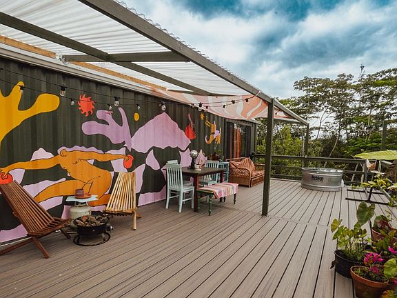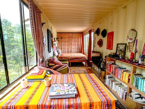 Escape to your own off-grid home on 6 acres with this unique artistic two-story container home set on 6 acres in Hawaiian Acres. Designed for sustainable living, this property features a mature orchard, expansive gardens, and breathtaking views of Mauna Kea with peekaboo ocean vistas.<br><br>The home’s lower level offers an 200 sqft open-air screened lanai with a full art studio, built-in shelving, sink, and wood-burning stove. Upstairs, you'll find the primary bedroom with floor-to-ceiling windows frame stunning sunrises and moonrises, while a large 400 sqft covered lanai with plunge pool provides the perfect space to relax and enjoy the scenery. A separate kitchen building complete with modern appliances, pantry, and its own water catchment that sits just steps away. Second bedroom is located in the 320 sqft. detached guest house, uniquely remodeled from a bus.<br><br>This eco-friendly property is powered by solar with a high-end LifePO4 battery system, features multiple water catchment systems, and includes a biogas flushing toilet. Modern comforts such as washer, dryer, and dishwasher blend seamlessly with its sustainable design.<br><br>Additional highlights include:<br>- Mature orchard with mountain apple, lime, loquat, mango, macadamia, and more<br>- Large fenced garden with a variety of fruits, herbs, and Hawaiian staples<br>- Brand-new greenhouse, garden shed, and covered workshop<br>- Fenced animal area with small barn and chicken coop<br>- Solar-lighted gravel driveway with iron gate and security system<br><br>Located on the last road in Hawaiian Acres, this property offers privacy and tranquility while still being just 15 minutes to Keaau Market Place and 30 minutes to Hilo. <br><br>More than just a home, this is a lifestyle perfect for artists, gardeners, homesteaders, and anyone seeking peace, privacy, and self-sufficient living in harmony with nature.<br>(sold together with MLS: 723876) This is a un-permitted structure.