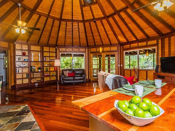Snuggled among the lush landscaping and mature plantings of Orchidland this lovely two bedroom multifaceted Cedar and Redwood home is the ideal setting for those who enjoy nature, privacy, and sustainable living. A large tiled lanai greets you upon arrival, and it's easy to envision lazy days listening to the birds. Step inside and take in the Ipe hardwood floors, Cedar and Redwood walls and sunlight streaming through the central cupola. The living area is large and open providing a versatile space that will suit many configurations while the spacious kitchen with new solid surface stainless steel Kenmore stove and new Kenmore refrigerator provide the tools necessary to produce meals for the whole gang. Feasts can be enjoyed around the central island with a beautiful Lychee and Cedar countertop, and prep work can be done on the durable concrete countertops. There's also plenty of storage in the cabinets with Cedar and Ipe doors and walk-in pantry. Just off the kitchen is a picturesque garden bath with slate floors, Ipe and Cedar cabinet doors, and a large window that can be opened to enjoy the surrounding nature while soaking in a hot bath. Two bedrooms can be found at opposite ends of the home each sporting those Ipe hardwood floors. The master features a built-in headboard with storage and shelves as well as a sliding glass door that leads to an outdoor shower area. Just beyond the main house down a spacious concrete path is building #2 measuring approx. 20X30. This unpermitted structure was used as "his and her" rooms (3rd & 4th bedrooms), but its new use is up to your imagination! Currently, each room features built-in loft beds, large built-in desk/craft areas, and ample additional space. There's also a permitted rec room built in the same style and multifaceted design with concrete floors and another expansive work area. With approx. 1 acre of perimeter fenced, a chicken coop, and small paddock area it's ready for you and all your family friends!