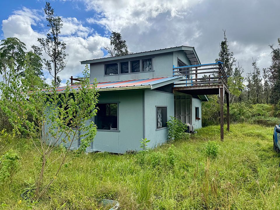 Rustic two-level structure with metal roof, upper lanai, and flexible interior layout. Solar system in place, surrounded by tropical greenery for privacy and airflow.