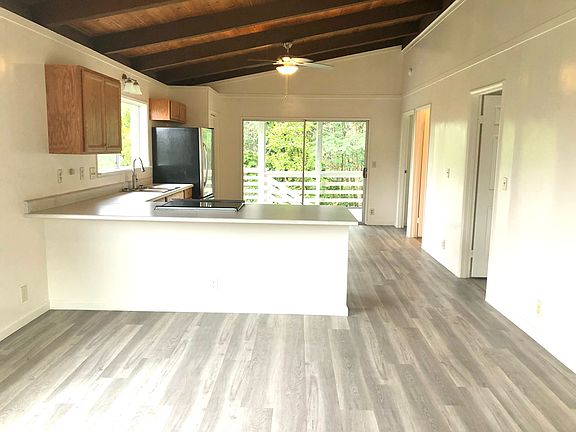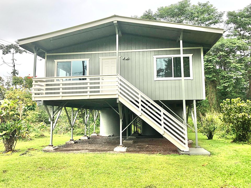 Splendid lanai at the back of this very high post-n-pier house. Located on a paved Tiki Gardens road, this one has three bedrooms, two bathrooms, and lots of ground space beneath the house (1,008sqft). Pet may be considered with a meet-n-greet and Pet Deposit. All utilities and yard are tenant's responsibility; water is catchment. An HBR application is required prior to showing - go to hbr dot managebuilding to complete one online.
