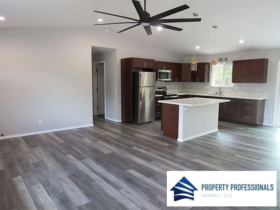 Welcome to your dream home in Ainaloa! This brand new construction boasts an open floor plan with 3 bedrooms and 3 bathrooms. The home is equipped with all new appliances, ensuring a modern and efficient living experience. The location is a standout feature, close to the highway at the top of the subdivision. A perfect blend of style, comfort, and practicality, designed to cater to a contemporary lifestyle. Experience the ease of living in this new home with many well thought out touches. Includes range, refrigerator, solar water heater, microwave, washer, dryer, yard service. Tenant responsible for electric, water, trash, cable, internet, phone. Exterior pet negotiable; must be kenneled & Pet Deposit applies.