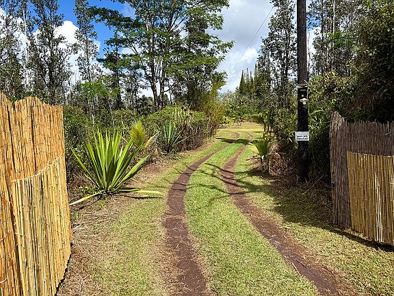 Located just one road off pavement, the property is easily accessed either through Ainaloa from Highway 130 or via Moho Road (8 Road) from Volcano Highway. A 400-foot palm-lined driveway leads past grassy lawns, fruit trees, and rock planters to the main home and a hand-built gazebo, surrounded by beautifully landscaped grounds.
