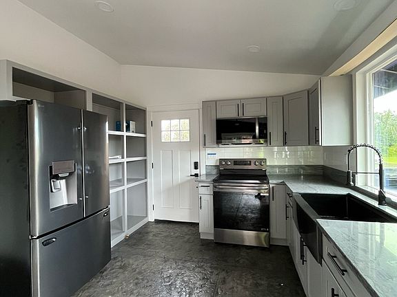 Vaulted ceilingBold black exteriorPine accentBlack stainless lg appliancesHuge pantryWater fall shower headVanity closet sliders