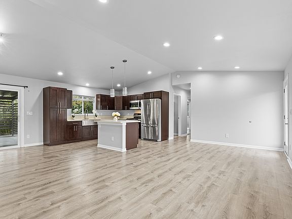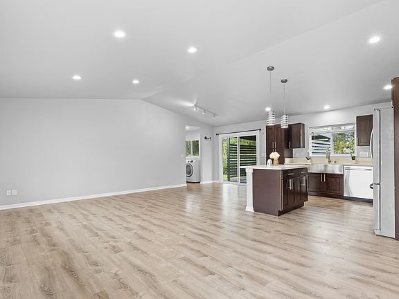 Enjoy the airy ambiance of vaulted ceilings that enhance the spaciousness of the open floor plan and complement the cohesive design while natural light pours through the living room windows, showcasing the beautiful laminate flooring.