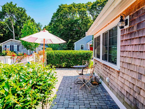 Tucked along picturesque Parker Road, between the Osterville Historical Museum and Wianno Golf Course, the beloved Aunt Tempy's Cottages capture the essence of Cape & Islands living - weathered shingles, crisp white trim, and beautifully kept grounds. This historic 10-unit association offers a lovely blend of character and convenience, all within steps of the village. Unit 5A underwent a full renovation in 2020, with thoughtful 2025 enhancements including a brand-new whole-house generator, new washer and dryer, new electric range, upgraded insulation, a new demising wall in the attic, and refreshed kitchen finishes with a new sink, faucet, and countertops. Sunlight streams into the open kitchen, dining, and living area, highlighting the elegant coastal details. The one-bedroom layout includes a stylish bath with a spacious shower, plus a bright sunroom overlooking the large patio and courtyard. With a sidewalk leading straight into Osterville Village, you can enjoy boutiques, cafes, and dining just moments from your door. Whether as a year-round home or a weekend retreat, this charming condo offers the quintessential Cape Cod lifestyle. Disclaimers: Interior photos are from a prior listing. The stainless gas stove was replaced with a white electric stove, which is currently there (owner preference). Could be converted to gas again. Kitchen sink was changed to a white sink, and the center island countertop improved. Sliding barn door in laundry closet off of sunroom was removed, but can be added back if a buyer wishes.