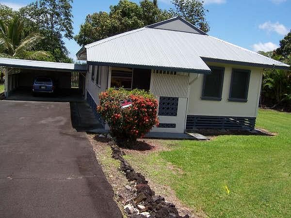 3 Bd, 1 Bath home on Keaau Loop. Gas stove, Electric heater, includes Water and Yard service. Coin-operated Washer/Dryer, 2 car Carport. Close to Keaau Shopping Center and Schools. Fully approved addition with 1 bedroom, bath, full kitchen approx 650 square feet. Not correctly listed on County Website. NO Pets, NO Smoking. Property shared with Ohana Studio.