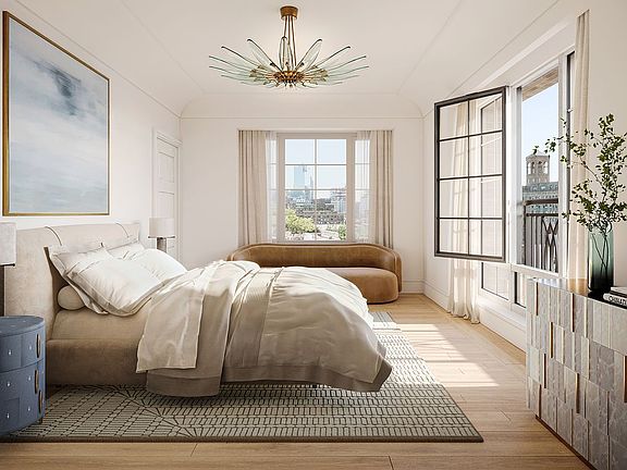 The primary bedroom wing is a private retreat with three dressing rooms, a terrace overlooking Fifth Avenue, and two luxurious primary bathrooms featuring Calacatta Vision honed marble walls and floors with a mosaic inlay, custom rift white oak vanities with marble countertops, a Kallista freestanding tub, an enclosed shower with Calacatta marble walls and floors, and radiant heat flooring.