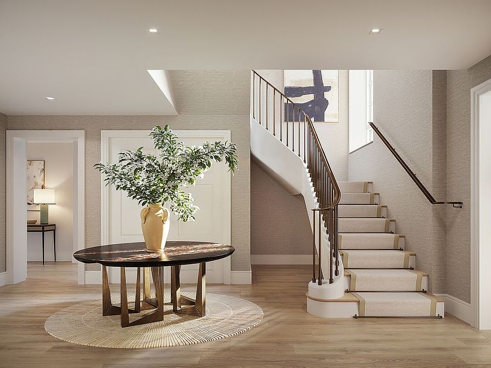 A private elevator opens into a double-height grand foyer leading to an expansive east and south-facing corner great room with herringbone-patterned 5” wide-plank white oak flooring and an adjoining terrace, both with iconic Fifth Avenue views. The windowed corner chef’s kitchen, designed by Christopher Peacock, features terrace access for outdoor dining along with Fifth Avenue views. Finishes and appliances include Calacatta Gold honed marble countertops and backsplashes, custom cabinetry with Lambourne-style polished nickel hardware, and top-of-the-line Miele MasterCool appliances including dual dishwashers and sinks with Kallista polished nickel faucets, a refrigerator/freezer, warming drawer, gas cooktop, oven, speed oven, vented hood, and a standalone wine refrigerator. A butlery, breakfast nook, and formal dining room complete the culinary experience.