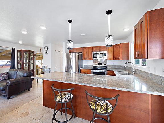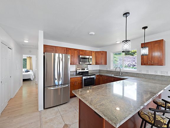 This home is conveniently located just minutes from the charming Kea’au town. This cute home is Located Close to Schools, shopping centers and local farmers market. This convenient location is the perfect combination of modern amenities and island-style living. As you enter the home, you are greeted by an inviting living room filled with natural light and a comfortable atmosphere. The open floor plan seamlessly connects the living room to the dining area and kitchen, creating a space that is perfect for entertaining guests or spending time with loved ones.The kitchen is equipped with beautiful countertops, soft close hard wood cabinets, Range and microwave range hood. The tile flooring in the kitchen provide a clean cool look to this updated kitchen. The primary bedroom is a true retreat with the privacy of nature all around. The additional bedroom is comfortable and welcoming providing plenty of space for guests. The outdoor living space is equally as impressive, with a cute yard and covered lanai that is perfect for outdoor dining or relaxation.