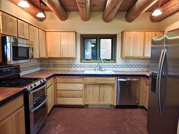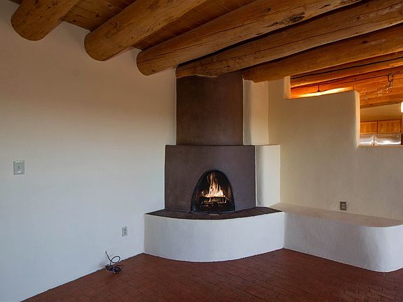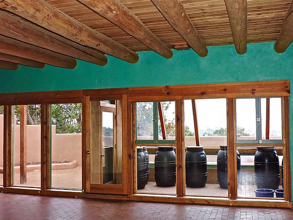 Classic Rational Alternative passive solar grand 3200 SF +/- adobe hacienda privately located, bermed into a treed hillside. South facing windows and greenhouse receive the winter sun, extra study/den, the brick floors and adobe walls absorb the heat. For additional comfort natural gas radiant heating was added throughout the home. Historically once equipped with active photovoltaic heating. The active solar hot water heater is still in use. A dramatic great room attached to the main home features a shepherds bed & fireplace ideal for guests or studio with separate entrance. The greenhouse indoor/outdoor patio has an operable skylight and windows to the main home. The roof rain waters drain to 2 large underground cisterns for landscaping & professionally maintained irrigation system. The mountain views and sunsets are expansive from walled patios. This organic home is a delight to show!