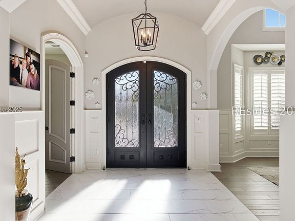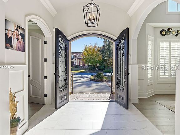 Welcome to 16 Anchor Cove Court, an extraordinary 4,136 sq. ft. custom lakefront masterpiece built by the renowned Randy Jeffcoat Builders, nestled within the gates of Hampton Lake-one of Bluffton's most sought-after luxury communities. This home captures the essence of Lowcountry living with a blend of timeless craftsmanship, architectural elegance, and serene lake views throughout. From the moment you arrive, the attention to detail is unmistakable. A hand-crafted front door sets the tone for what awaits inside. Step into a grand foyer highlighted by 16-foot coffered ceilings and a 20-foot domed ceiling in the dining room, both displaying exquisite custom trim work that showcases the artistry of true master craftsmen. The great room features beautiful built-ins, a custom mantle, and an elegant fireplace-perfect for gatherings or quiet evenings. A den offers a comfortable retreat overlooking the tranquil lake. The gourmet kitchen is a chef's dream, boasting high-end appliances, an expansive eat-in layout, a walk-in pantry, and a butler's pantry for seamless entertaining. The primary suite is a private oasis, complete with a sitting room overlooking the water and a spa-inspired bathroom with luxurious finishes designed for ultimate relaxation. The home offers 4 bedrooms and 3.5 baths, including an impressive upstairs suite with its own sitting area, full bath, and abundant storage-accessible from both the main home and a secondary private entrance, ideal for guests or multigenerational living. Additional features include a built-in mudroom, custom millwork throughout, and ample storage for effortless organization. Step outside to experience one of the home's crown jewels-the screened-in outdoor living area. Overlooking the lake, it features a built-in outdoor kitchen, pizza oven, and fireplace, creating the perfect setting for entertaining or relaxing year-round. This one-of-a-kind residence truly defines luxury lakefront living in Hampton Lake, where resort-style amenities, natural beauty, and exceptional craftsmanship come together. Don't miss your opportunity to own one of Bluffton's most distinguished custom homes.
