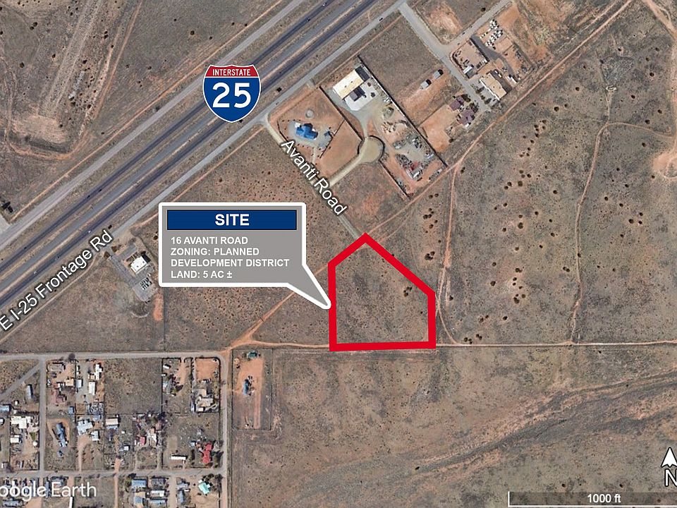 Commercial land near the I-25 East Frontage Road in Santa Fe County. Water, gas and electrical utilities are available on the frontage road and need to be extended. Zoning is Planned Development District allowing for commercial, industrial, residential, hotel/motel, religious, educational, and more. Sale is subject to a lot split by seller prior to closing.