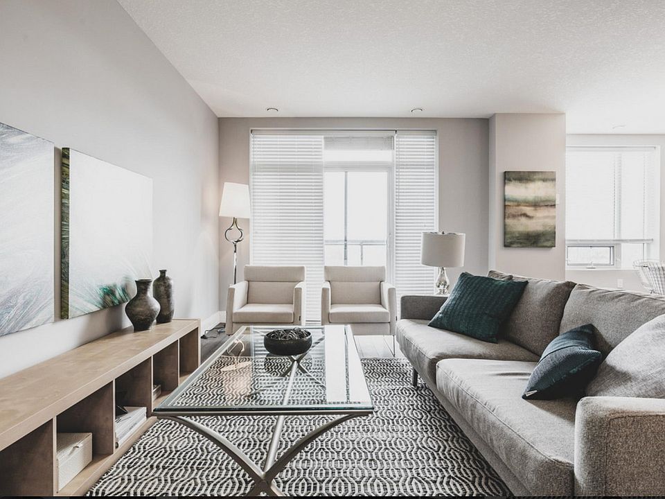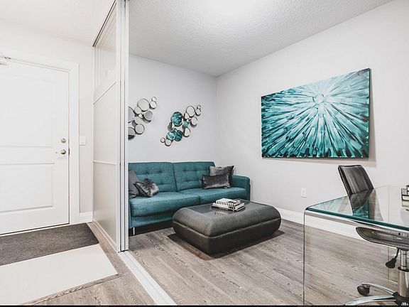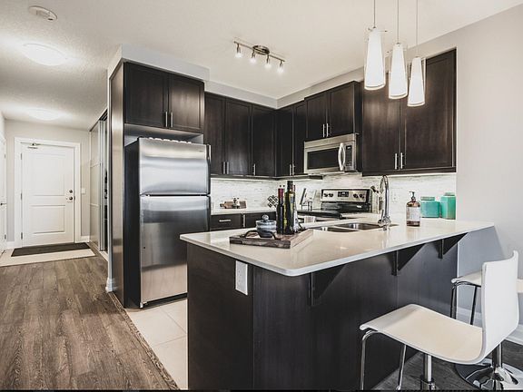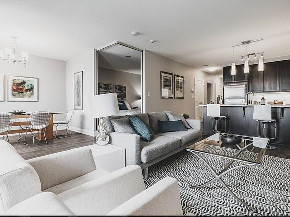 Tons of natural light, stainless modern fixtures & appliances, quartz counters, high ceilings, fitness center, yoga studio, sauna, movie theatre, rooftop terrace, lounge, billiards, party room, library, storage/bike room, parcel lockers, guest suite, boardroom, EV chargers, pet friendly, luxury vinyl plank floors and carpet in bedroom, custom window coverings and one parking place.