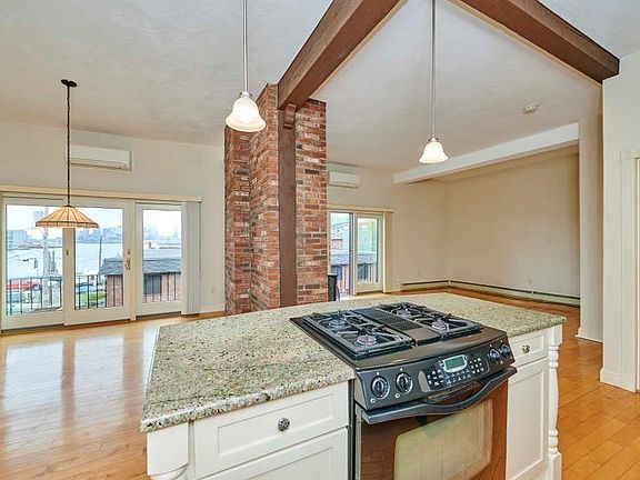 Rarely Available Chelsea Historic Waterfront Condo- Check out this well spaced 2 bedroom and 2 bathroom home. Both Bedrooms have Large closets. Hardwood floors are placed throughout. The main area has a horseshoe open layout that contains the kitchen, dining and living room. Kitchen area has modern white Cabinets with granite counters and a gas stove kitchen island. Brick walls accent both the dining and living room areas. The Antique Washington "Olympic" model wood burning furnace is the center of attention in the living room. Both the living room and dining area have sliding doors South facing to a Private Balcony with Boston City/Harbor views. The double windows and sliding doors insure both soundproofing and heating/cooling efficiency. 1 Off Street Parking Space assigned to unit. Close walking distance to Chelsea Sq shops (Ciao Pizza, DDs, 7-11, Liquor Stores) and MBTA 111/116/117 Bus Route. Taxes include The FY 2023 Residential Exemption is $3,018.03.