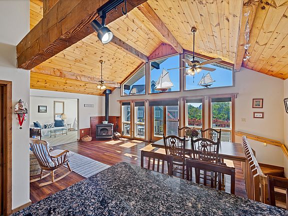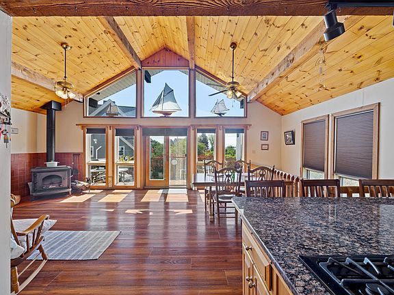 The second floor features a spacious primary suite, a well-appointed kitchen, and multiple light-filled living areas, all enhanced by cathedral ceilings and access to a private deck—perfect for entertaining or relaxing with ocean views.