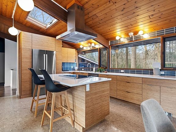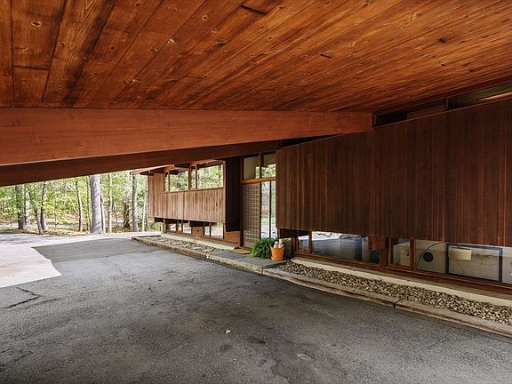 Nestled on over 3 acres in scenic Boxford, this stunning Mid-Century Modern Deck House offers a unique blend of timeless architecture and contemporary updates. A bright, open floor plan showcases the clean lines and natural materials characteristic of the style, while wall-to-wall windows invite light and nature into every room. Featuring 4 bdrms and 2 full baths, the home has been thoughtfully renovated for modern living. The completely updated kitchen (2022) boasts ceramic tile flooring, custom bamboo cabinetry, quartz countertops, Bosch SS appliances, and a sleek Zephyr hood. A newly installed high-efficiency Viessmann boiler and hot water heater provide year-round comfort and energy savings. Gorgeous Ipe wood flooring flows throughout the main living spaces, enhancing this home's warm organic feel. Step outside onto an oversized deck that offers the perfect space for entertaining or relaxing. An extended roofline provides a sleek carport that complements the home's design.