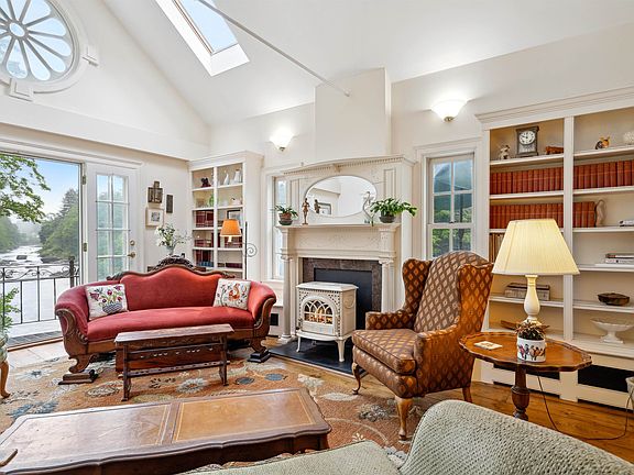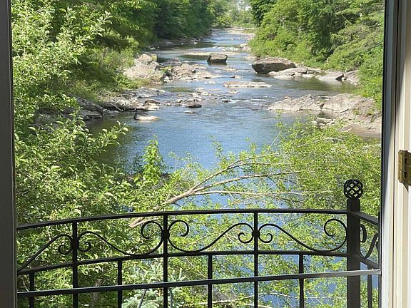 16 Church has the most stunning view of the river from any house in the village that we have seen, perched up above a series of river rapids so the sounds of the river during the day or in the evening are incredibly peaceful and relaxing. Plus, 16 Church is privately nestled in, like a secret hideaway, yet steps to the village green (and a level walk to/from). And more unusual for the village, it has a two-car garage with a covered walkway into the mudroom entryway (plus more outside parking). The spacious kitchen/dining area opens to the vaulted-ceiling living room, which has an INCREDIBLE view up-river. A side door leads to the side-deck that has the same view and sound of the river for outdoor dining above the river. There is a propane woodstove in the living room and woodstove in the kitchen/dining. A 1st floor bedroom has an ensuite bath and small stack washer-dryer. Upstairs is a large bedroom looking out through the great room to the river, a smaller bedroom, a bath and lovely loft area above the living room. Downstairs is a large den/rec/office, a bedroom, a bathroom, the main laundry room and mechanical room, all renovated 11 years, post the Irene storm, when the river waters came up into the lower level. There are beautiful gardens in the front and rear of the house. SEE PROPERTY WEBSITE FOR 16 CHURCH ST WOODSTOCK FOR MORE DETAILS, FLOORPLANS HI REZ PHOTOS AND MORE.