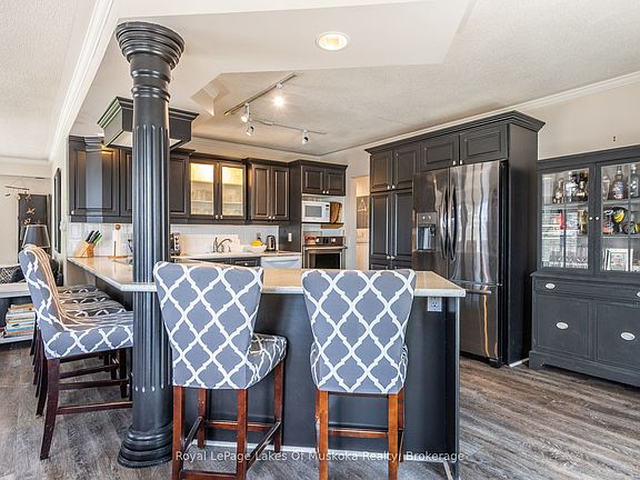 This spacious warm and inviting family home has a bonus 2 + den lower level walk out legal non-conforming apartment. Nestled in the heart of downtown Huntsville with a walking score of 10 to all amenities including the mall in this prime sought after area. The 4 bedroom main residence has been a beloved gathering place for family and friends for decades with a bright open concept kitchen/dining and living room surrounded by a window wall and a beautiful custom gas fireplace anchors the room. Kitchen features built in appliances and massive island for the gourmet cook to enjoy creating while still in the middle of the conversation and energy with 6 bar stools for everyone to gather. The main level also offers 3 bedrooms, one with a walkout and a main bathroom and laundry with another walk out to your private rear yard not feeling like you are in the center of town. The 2nd level boasts a large master suite including your 3 piece ensuite and separate office with a private deck. The lower level 2 + den legal non-conforming apartment has open concept living/dining/kitchen with a gas fireplace, 4pc bathroom and laundry. The current owner has had family renting the lower level for many years and now it is vacant and ready for a buyer to use it or rent it out. The apartment and the main residence both have their own separate driveways and parking areas which are interlock brick and in great shape. The main residence enjoys a large wrap around deck plus a patio and a gazebo in the very private backyard. There are no homes behind so it does feel peaceful and removed from the bustle of downtown. This home has been enjoyed by the same family for over 30 years and offers many opportunites for a new family or as an investment. A pleasure to view!