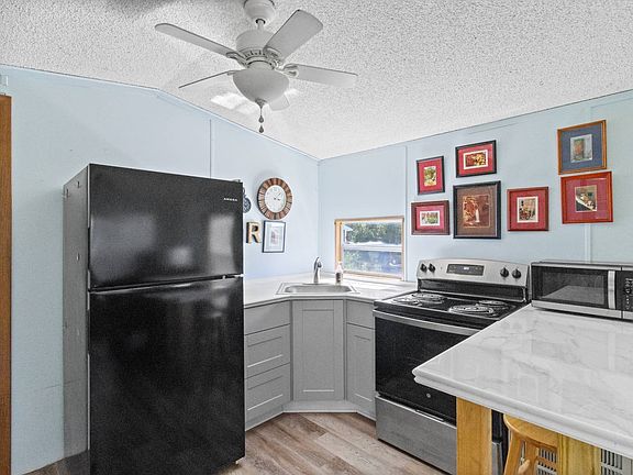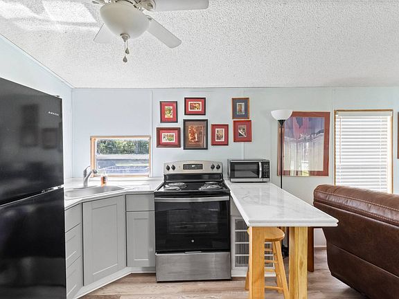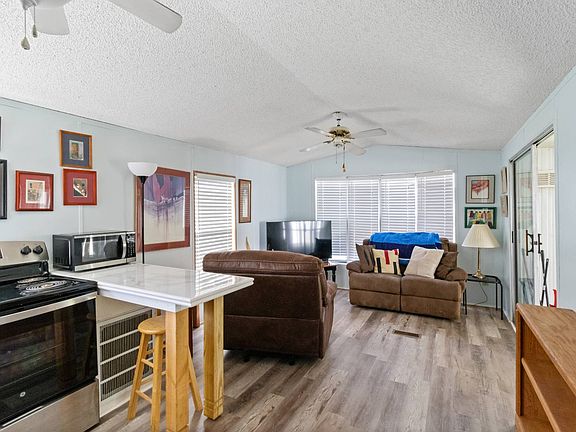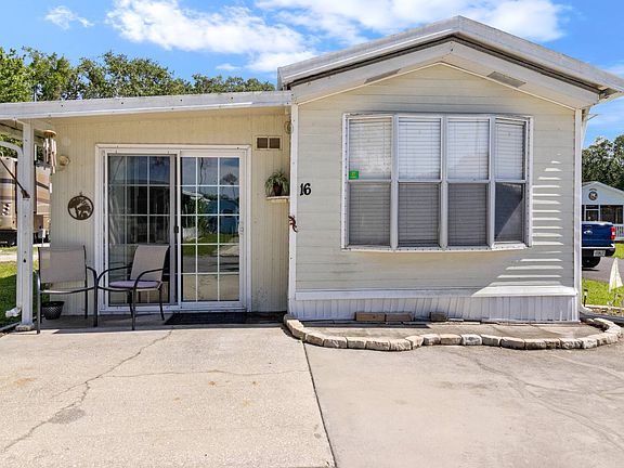 Welcome to this charming and beautifully updated one-bedroom, one-bath mobile home nestled in a vibrant, pet-friendly 55+ community. Completely renovated in 2022/23, this inviting home offers new flooring throughout, a modern kitchen with stylish finishes, and a brand-new bathroom-everything has been replaced to provide peace of mind and comfort. The open floor plan fills the main living area with natural light, and the home's windows offer lovely views of the community pond and screened pavilion. In addition to the 363 sq ft main living space, a fully air-conditioned, glass-enclosed Florida room adds another 330 sq ft, creating a spacious total of 693 sq ft for relaxing and entertaining. Inside, you'll also appreciate the convenience of an indoor laundry room and the bright, airy atmosphere that flows throughout. Residents of this friendly community enjoy a sparkling pool, shuffleboard courts, a welcoming clubhouse, and a scenic pond with a large, screened pavilion perfect for gatherings. There's always something to do, thanks to a full calendar of planned activities that make it easy to stay active and connected with neighbors. The monthly land lease of $655 includes access to all amenities, as well as water and trash services, ensuring easy, low-maintenance living in a warm, well-kept neighborhood that welcomes your furry friends. Don't miss the chance to enjoy affordable, carefree living in a beautifully renovated home with peaceful pond views and resort-style amenities-come see it for yourself!