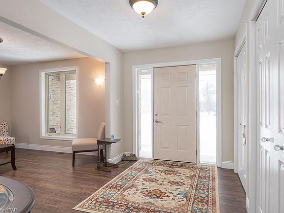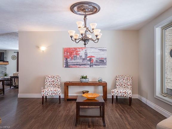 Welcome to 16 Dinsley Terrace. This stunning property is situated on a 1.25 acre lot and backs onto the Bayfield River. The views are spectacular, the home is immaculate and has everything you need. The 2175 sq/ft brick bungalow features a large entryway, eat-in kitchen with custom cabinetry and built-in appliance, family room, living room with new gas fireplace and stone surround, all new flooring, new trim and freshly painted. Main floor laundry, 4pc bath including a corner tub, guest 2pc powder room, 2 guest bedrooms and oversized master bedroom with 3pc ensuite. Fully finished basement with walkout, spacious rec room, wet bar, gas fireplace and custom flagstone flooring, 3pc bath, large workshop and additional utility room. This spectacular property has it all, including hot tub with gazebo, covered patio area, raised deck, landscaped yard, water feature, flagstone path. These executive homes on the River don't hit the market very often, call your Realtor today for a private viewing.