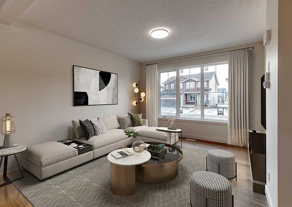 Double-attached garageGround-level flex roomOpen-concept main floorEngineered hardwoodElectric fireplaceModern kitchenQuartz countertops