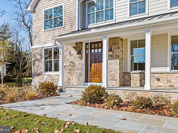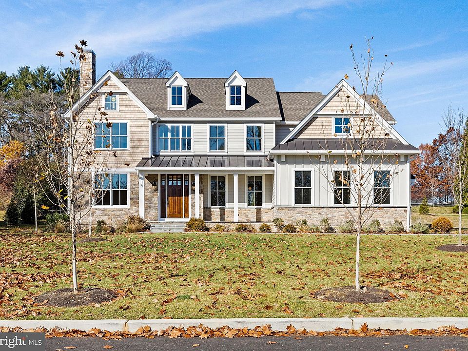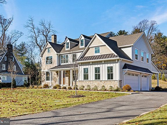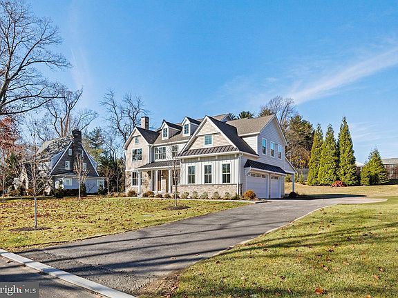 This stunning new construction home combines the warmth and character of a classic Main Line residence with the craftsmanship and amenities of modern luxury living. Thoughtfully designed and filled with architectural detail, it feels anything but cookie-cutter—each space tells a story of elegance, comfort, and care. From the moment you arrive, the Hardie board and cement board cedar shake exterior set the tone for quality and sophistication, accented by a charming bluestone walkway that leads you to the front door. Inside, a sunlit foyer welcomes you with wide-plank hardwood floors, a beautifully crafted staircase with direct-set spindles, and richly trimmed walls. To one side, a formal living room (or office) features detailed millwork, a gas fireplace, and custom pocket doors for privacy. Adjacent to this room is a formal powder room with designer finishes. Across the hall, the dining room offers classic wainscoting and connects seamlessly to a butler’s pantry with custom cabinetry, sink, and wine fridge—perfect for entertaining. The back of the home opens to an expansive living area that blends a chef’s kitchen, eat-in area, and great room. The kitchen is the heart of the home, featuring custom cabinetry and hood, a 48" gas range, built-in refrigerator, microwave, and dishwasher. A large center island with quartz countertops anchors the space, providing ample workspace and seating for casual dining. The kitchen also offers two pantries—one walk-in and one reach-in—for exceptional storage. The adjoining great room impresses with a coffered ceiling, gas fireplace, and French doors leading to a covered bluestone porch with a stone fireplace—an incredible space for relaxing or entertaining. A mudroom with custom cubbies, beautiful tile flooring, and a second powder room connects directly to the three-car garage, completing the main level. Upstairs, the primary suite is a sanctuary with vaulted, beamed ceilings, two walk-in closets, and a spa-inspired bath featuring a soaking tub, walk-in shower, double vanity, and serene, custom finishes. Four additional bedrooms offer generous closet space—two with ensuite baths and two that share a well-appointed hall bath. A laundry room with built-in cabinetry, sink, and countertop workspace adds everyday convenience. The lower level is designed for entertaining, with hardwood floors, a full wet bar with wine storage, and abundant natural light. A rough-in for a future full bath allows for even more flexibility. Situated on a quiet horseshoe street less than a mile from downtown Wayne, this home offers walkability to shops, restaurants, and the train—all within the highly sought-after Radnor School District. Move-in ready and masterfully built, this residence blends timeless craftsmanship with every modern comfort.