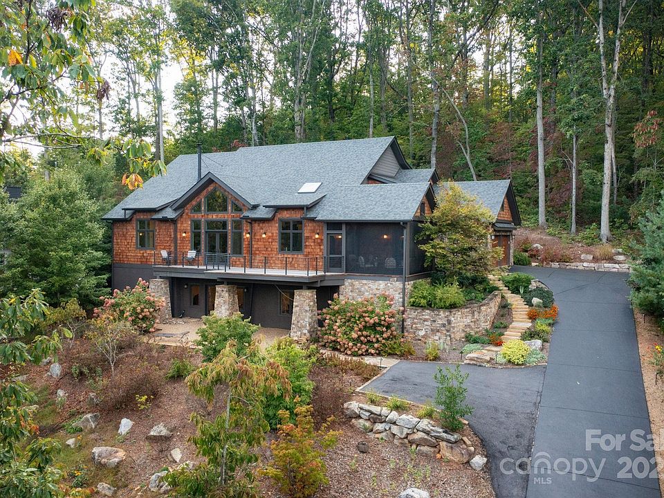 Stunning 2018-built custom home with year-round mountain views just two miles from downtown Asheville in sought-after Beaucatcher Heights of Kenilworth. This 4BR/4.5BA offers ideal one-level living with the primary suite, laundry, and garage on the main floor. Its modern, open floor plan includes a living room with massive windows, a stone and natural gas fireplace, and a custom stairwell and built-ins. The chef’s kitchen dazzles with Alder cabinetry, leathered granite, a walk-in pantry, an oversized eat-in island, and screened porch access for outdoor dining. The spacious Cumaru deck, private stone back patio, and mature landscaping create a serene retreat. The primary suite offers a spa-inspired ensuite bath and a large custom closet. Upstairs includes two ensuite bedrooms; basement adds a guest suite, living area, and abundant storage/workshop space. An attached two-car garage and office space all complete this thoughtfully designed home. See video, brochure, and floor plan for more information.