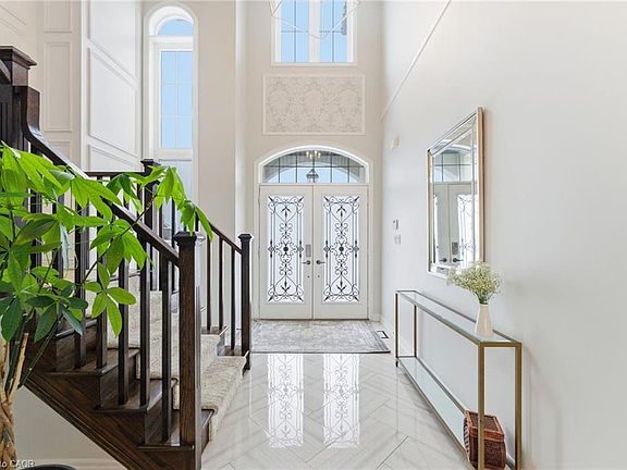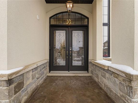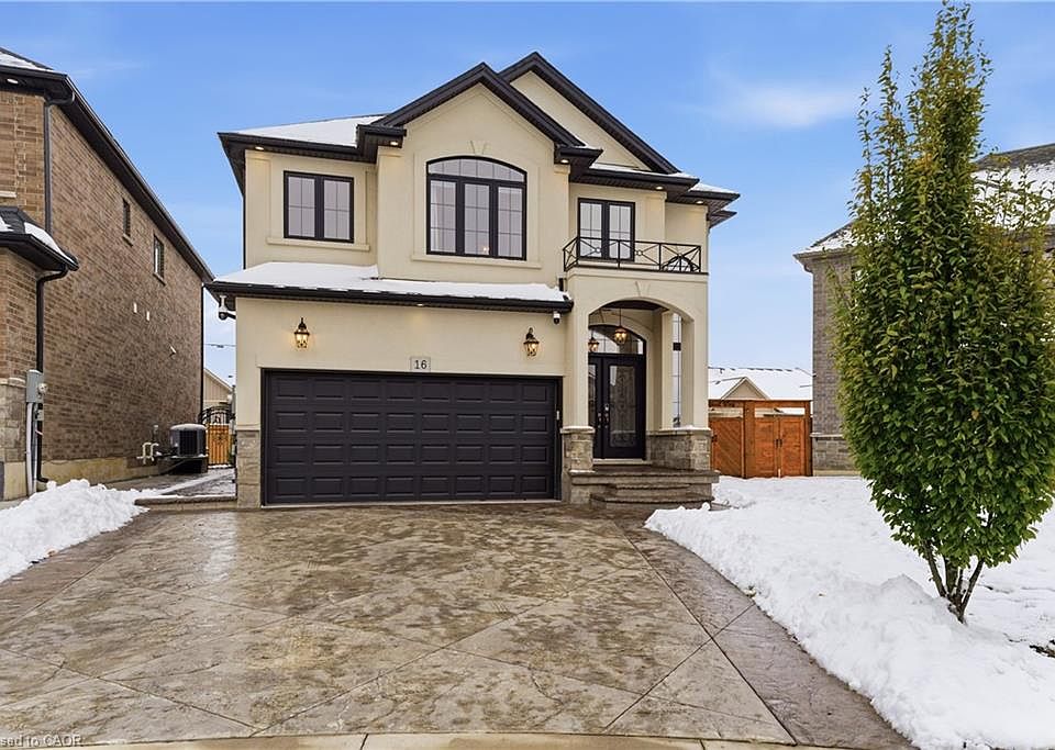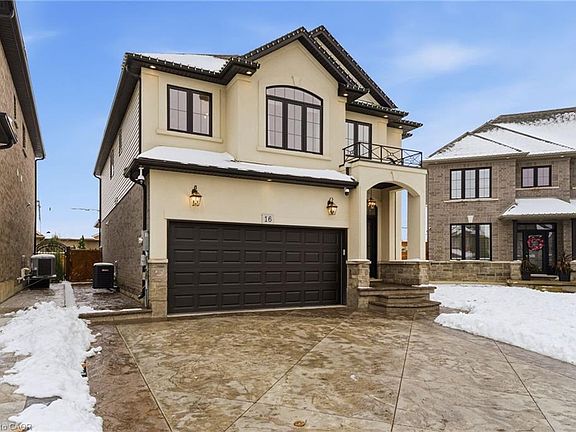 Welcome to 16 Festival Way, an executive residence featuring nearly 3,700 sq. ft. of luxuriously finished living space, set on a large, pool-sized, pie-shaped lot. Nestled in one of Binbrook's most prestigious courts, this exceptional 4 bedroom, 4 bath home effortlessly blends timeless elegance with modern sophistication. Step into the impressive 2-storey foyer, where wainscoting and herringbone tile set the tone for refined design. The open-concept main floor showcases natural white oak hardwood and crown moulding throughout, creating an inviting yet upscale atmosphere. At the heart of the home lies the custom chef-inspired kitchen, featuring an expansive 10-foot island, oversized cabinetry, quartz countertops, and top-of-the-line GE Café and Jenn-Air appliances. The adjoining living room centers around a custom tiled bio-ethanol fireplace, while the formal dining room, powder room, and laundry/mudroom complete this beautifully designed level. Beyond the 8-foot glass doors, your outdoor oasis awaits a custom stone kitchen with concrete countertops, built-in natural gas Napoleon grill, and a spacious covered patio with cedar ceiling & pot lights ideal for year-round entertaining. A massive stone fireplace adds warmth and ambiance, making this the perfect retreat for cozy evenings. The upper level continues to feature white oak hardwood floors and crown moulding, leading to four generous sized bedrooms. The primary suite is a true sanctuary, featuring a spa-inspired 4-piece ensuite and a custom-built walk-in closet designed for ultimate organization and style. The fully finished basement provides comfort and versatility, complete with plush designer carpeting, an open-concept media room with a 130" high-end projector screen and built-in surround sound system, plus an oversized gym with mirror wall, a 3-piece bathroom, and ample storage. This remarkable home is rare, combines luxury, craftsmanship, and thoughtful design inside and out.