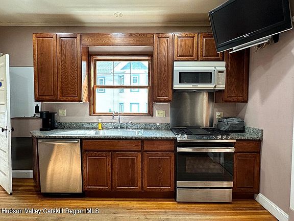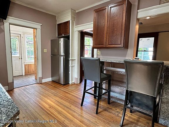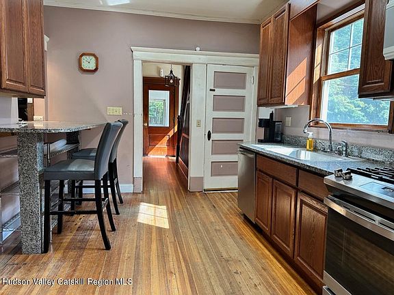 LIVE,WORK,PLAY! located in HAMLET BUSINESS area of Big Indian just off of ROUTE 28 just minutes from NYS hiking, Peekamoose Restaurant, Belleayre Ski Center , Platte kill Ski, Windham and Hunter Ski. This 5+ bedroom SKI HOUSE, features beautiful turn the century woodworking with hardwood floors, a sun lit wrap around glassed-in porch, beautiful level yard perfect for a pool with mature plantings, a one car plus storage area garage, plus an additional house lot in the rear of the property which will be cleared before closing and a full clean basement ready for your projects or storage area. House has been updated with new siding, a new kitchen, stainless steel appliances, granite countertops, new upstairs washer and dryer. Entertain and relax all day long on the large double level back deck. Also, a ready to plant raised outdoor garden space for your vegetables. In addition, enjoy the efficiency of the heat pump system with backup of cast-iron radiators for cozy even heat in the colder months. This property is zoned Highway Commercial with many business uses allowed. A great Price!