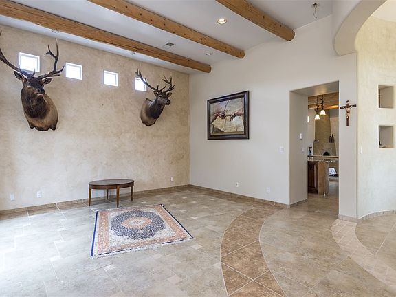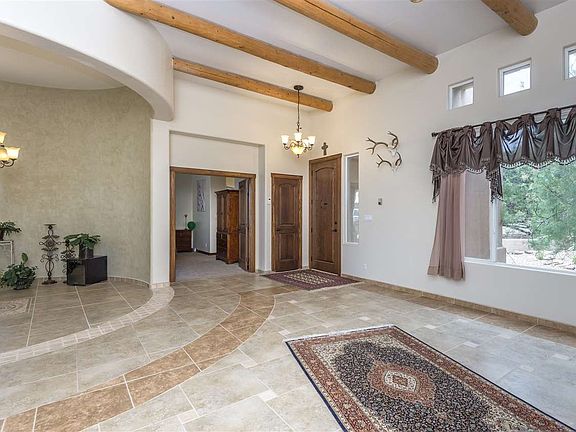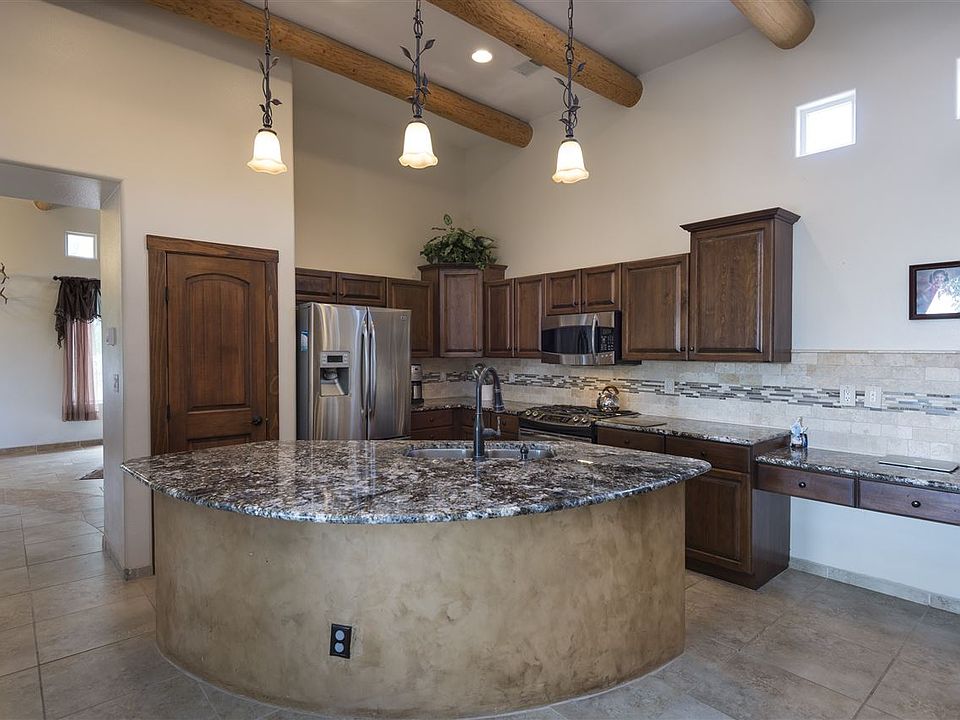 Beautiful 4 bedroom home on an outstanding 1.35 acre lot in desirable Rancho Viejo. This home has been wonderfully updated with quality finishes and has a fantastic floor plan with great bedroom separation. The floors have been beautifully re-tiled with great attention to design. All doors and cabinets have been replaced with beautiful custom doors and oil rubbed bronze hardware. Many of the walls are faux painted or accented with lovely Venetian plaster. The kitchen is absolutely gorgeous with the most stunning slab granite counter tops and the center island will amaze and impress your guests. Upgraded stainless steel appliances in the kitchen for modern luxury. The family room is open to the kitchen for casual living and offers vigas and a woodburning kiva fireplace for Santa Fe flair. There are three bedrooms to the rear of the home and the guest bath also has beautiful granite counter top and new fixtures. The master is spacious with sliding doors to the landscaped courtyard and huge walk-in closet and luxuriously appointed bath. The central courtyard has flagstone, native trees, and plants and is on a drip system. There is a rear yard for the gardener or hobbyist. Two car garage and ample parking space and the long driveway from the road offers great seclusion and privacy. The roof and stucco have both been replaced in recent years so this home is in outstanding condition. Rancho Viejo is a great place to call home with over 12 miles of walking trails & community parks.