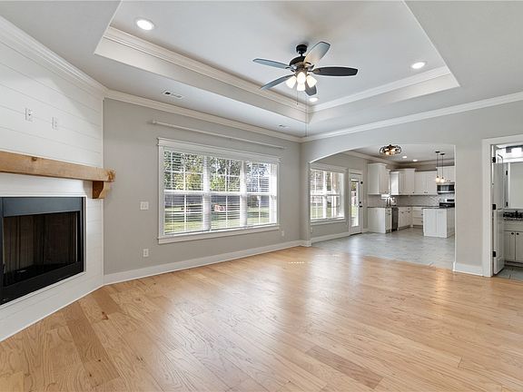 Inside, discover thoughtful architectural details including crown molding, trey ceilings, and a graceful arched entryway connecting the dining and living areas.