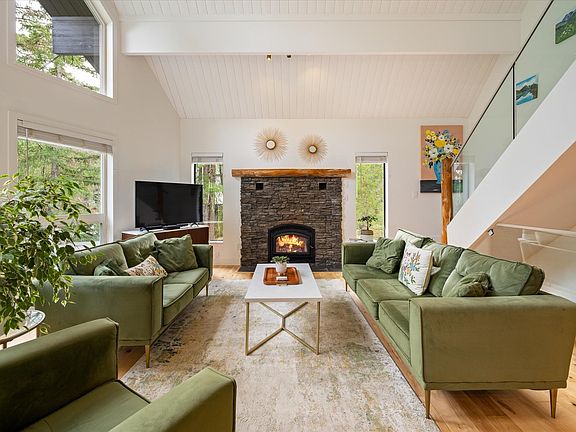 Private Black Tusk Village home blending contemporary comfort with a private treed setting, mountain views, and backing onto Pinecrest Lake with dock access. Vaulted ceilings and expansive windows fill the main level with light, featuring a wood-burning fireplace and a flexible bedroom/den/office space. Upstairs offers two bedrooms; the lower-level master retreat boasts a spa-inspired ensuite and heated floors. Recent upgrades include remodeled bathrooms, updated electrical with EV charging, LED lighting, and a deck with glass railings. Enjoy outdoor living with a covered deck, perennial garden, paved driveway with RV parking, and a two-room studio. Community amenities include private lake access, tennis courts, and trails—your turnkey Whistler escape.
