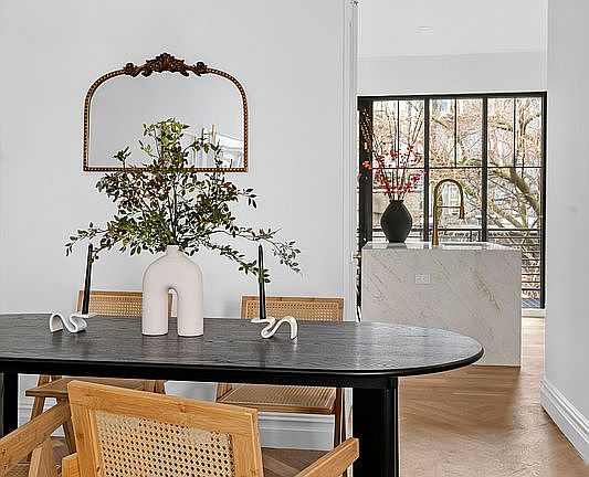 The expansive owner's duplex features herringbone white oak floors, central A/C and heat, sconce lighting flanking the original mantle, a thoughtfully designer powder bathroom with custom natural stone sink and a functional and tucked away dining nook off the kitchen.