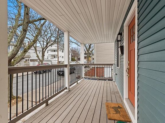 Beautifully renovated top level condo. Open floor plan living area with cathedral ceiling living room. Spacious kitchen with center island, subway tile backsplash, and stainless steel appliances. Large closets with built in organizers in bedrooms. 2 full baths with tile detail and in unit laundry. Hardwood floors throughout the main living area and bedrooms. Large secure storage area in basement. Spacious front porch and rear deck, plus common patio area & deeded parking. Energy efficient appliances & central air. Convenient location - just a brief distance to Mystic River paths, Davis and Teele Squares, and Tufts University. Easy access to highways and public transportation.
