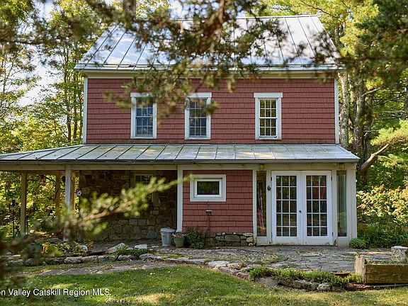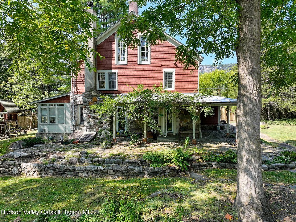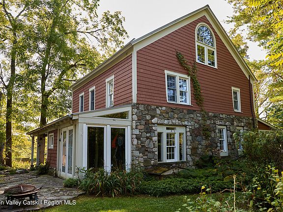 This charming farmhouse on Hasbrouck Road is framed by the timeless beauty of the nearby Shawangunk Ridge, a haven for hikers, climbers and nature lovers. Adding to the sense of place, stones from the property are incorporated into the living room fireplace and the artful stonework found outside the home--patios, walkways, tiered stone walls and garden beds. The exterior is a mix of stone and cedar shingle siding, and the standing seam metal roof was installed by the current owners. Dating back to 1853, the house has the details you'd expect--wide wood floors, original mouldings, paneled doors with vintage knobs, and built-ins. The windows are modern, but maintain the period look with 6-over-6 divided light. In the kitchen you'll find timeless custom cabinets with glass doors and patinaed brass latches and cup pulls, bluestone and butcher block countertops, a 6-burner Jenn-Aire gas range, and a rustic ceramic tile floor. Off the kitchen is a mudroom with french doors and a half bath. A cozy dining room, living room with working fireplace, and south-facing sunroom round out the first floor. Upstairs there's a colorful wardrobe at the second-floor landing, 3 bedrooms, an office and a full bathroom with stacked washer/dryer. The walk-up attic is unfinished and currently used for storage. Ornamental vines adorn the covered front porch, which looks out to the shed and gently sloping lawn. Wood privacy fencing encloses the main portion of the 3.59 acre property and includes a convenient gate to the road and double swing gate to the driveway. Nearby Mohonk Preserve and Minnewaska State Park offer year-round recreation in nature (hiking, biking, swimming, skiing), and local farms grow seasonal goodness (Jenkins-Leuken Orchard, Tweefontein Farm, Wallkill View). The villages of New Paltz and Gardiner are close at hand for dining, shopping and other amenities. Call to book a showing today.
