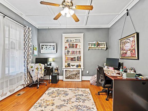 Front porchHardwood floorsTwo outbuildingsPrivate spacious backyardDining roomPrimary suiteCrown molding