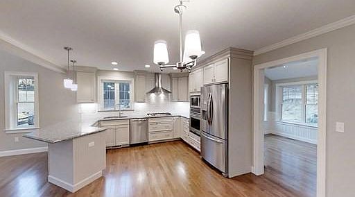 - Kit Dscrp: Flooring - Hardwood, Countertops - Stone/Granite/Solid, Recessed Lighting, Dining Area, Kitchen Island, Open Floor Plan, Main Level, Deck - Exterior, Slider, Peninsula