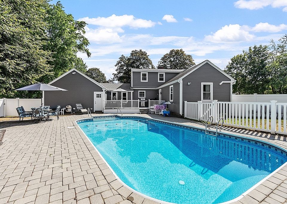 This beautifully updated 4-bedroom home with an additional office/playroom is designed for today’s lifestyle. The main level offers a fully renovated kitchen with custom cabinetry and high-end appliances, a primary bedroom, second bedroom, and versatile office/playroom with built-ins. Upstairs are two spacious bedrooms, a full bath, and a walk-in closet. The partially finished basement provides approx. 502 sq. ft. of flexible living space, ideal for a family room, gym, or hobby area. Recent upgrades include new siding with insulation, Mitsubishi Hyper Heat mini-splits, Buderus boiler, high-end kitchen, and new insulated exterior doors. Outdoors, enjoy a fenced yard with in-ground pool, newer liner, Loop-Loc safety cover, solar cover, variable-speed pump, paver surround, and a composite deck—perfect for entertaining. Corner lot with easy Mass Pike access for commuting to Worcester, Boston, and beyond, in a sought-after school system.