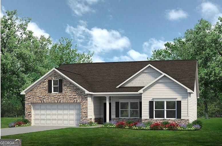 Move in Ready December! The Lancaster offered in Jones Ridge by Smith Douglas Homes. This ranch-style home truly has it all. Just off the foyer is a versatile flex room that offers endless possibilities- use it as a formal dining room. private study, or a cozy living space to suit your needs. At the heart of the home, the open-concept fireside family room, kitchen and breakfast nook create a warm and welcoming space that flows effortlessly to the covered back porch, perfect for entertaining or relaxing outdoors. The kitchen features a large center island with Quartz counters and generous storage, while a convenient mudroom off the garage keeps everyday essentials organized. The primary suite with a tray ceiling is thoughtfully tucked away for privacy and includes a spacious walk-in closet. Secondary bedrooms are located in their own hallway off the foyer, giving everyone their own retreat. Vinyl flooring runs through the main living areas. Nine ft ceiling heights enhance the spaciousness of the home. Seller incentive with the use of preferred lender. Photos representative of plan not of actual home.