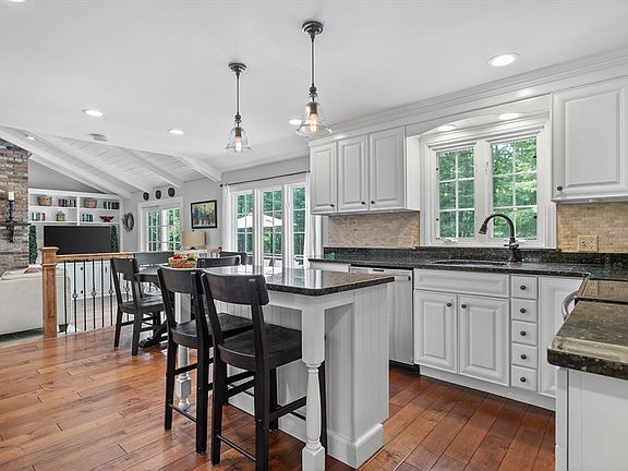 Location, Location! Stately Brick Front Colonial located on a cul-da-sac is conveniently located in Desirable Neighborhood! The updated White kitchen w/elegant Cabinetry & Granite Island is all open to the Cathedral Ceiling Fireplace Family Room w/Shiplap Ceilings & built in shelves gives it the Nantucket Feeling w/slider out to deck overlooking the fabulous Private lot & inground Salt Water Heated Pool. Family RM has access to two Car Attached Garage & additional one Car Garage. Half bath & laundry is located off the Kitchen.The Charming Dining Room is located off the kitchen w/Wainscoting. Front to back Fireplace Living Room & Great Room addition w/Coffered Ceilings ideal for entertaining for the holidays. Upstairs consists of 4 Bedrooms & 2 updated Full Bathrooms. The Masterbedroom Suite w/double closets & updated bathroom w/classic Carrera Marble oversized shower. Lower level is Finished w/two additional rooms ideal Office/FR & Play Room. Minutes to Wholefoods, Starbucks &MajorRtes