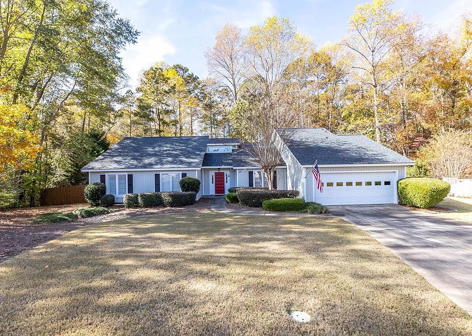 Welcome home to this charming 3-bedroom, 2-bathroom home situated on 1.19 acres in North Columbus! This beautifully maintained property offers both peaceful privacy and convenience. Step inside a welcoming entryway that opens into an inviting living space, featuring vaulted ceilings, a brick wood burning fireplace, and an abundance of natural light. A separate formal dining room provides an ideal space for gatherings and holiday meals. The sunroom, with its tall ceilings and walls of windows, is a stunning highlight, offering year-round enjoyment and serene views of the backyard. The kitchen features granite countertops, tile backsplash, and an eat-in kitchen area overlooking the property. The spacious primary suite offers vaulted ceilings and an ensuite bath with granite vanity and tiled shower. Two additional bedrooms and a full bathroom provide excellent space for family, guests, an office, or flex use. Outside, enjoy your own beautiful in-ground pool, deck, and wooded views - perfect for entertaining, relaxing, and making memories. Additional features include a two-car garage, fenced areas, and a quiet cul-de-sac location just minutes from shopping, dining, schools, and I-185.