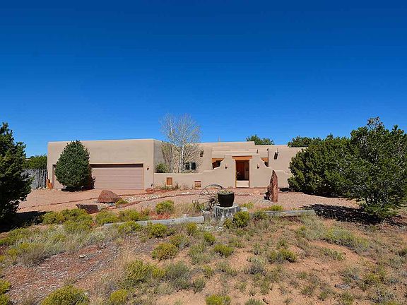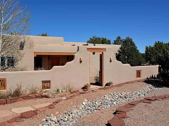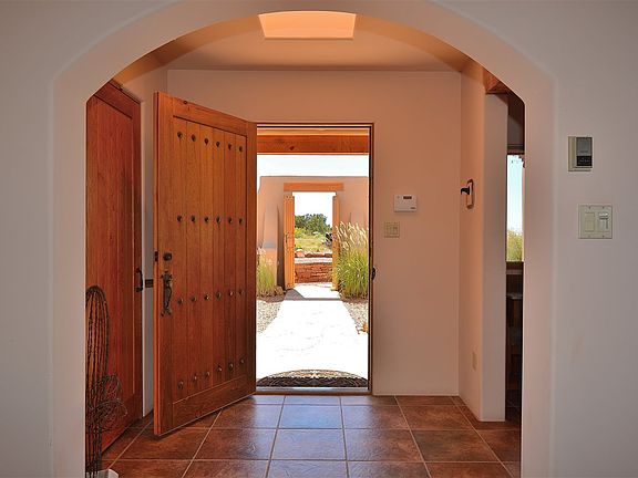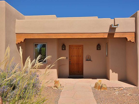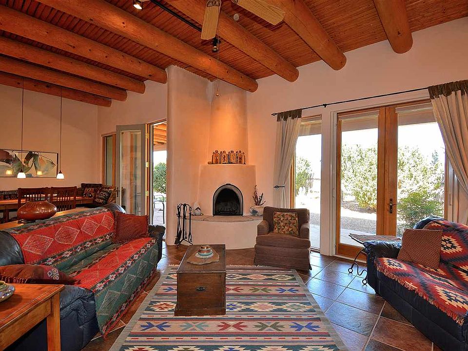 Peace and privacy distinguish this exquisite, custom home featuring unobstructed views of the Sangre de Cristo Mountains. Enter the serene front courtyard through tall antique doors, past rustling aspens up to the substantial handcrafted front door. From the open door the mountains can be seen through French doors in both the living and dining areas. The open floor plan is as graceful as it is convenient. With ceramic tile floors throughout, tasteful Santa Fe style warms the entire house. From the vigas and latillas in the main living areas and a beautiful big corner banco in the dining room to a beautifully coved ceiling in the Master bedroom and toasty kiva fireplaces in both the Master and the living room, this home has too many beautiful details to list. The light-filled kitchen is spacious and well-organized with tile counters, gas stove and built-in breakfast area. Bedrooms are nicely separated from each other. One is currently used as a den and each bedroom has French doors to the outside. The landscaped, back-yard is fenced and has a flagstone portal running the length of the house. Additionally, there are 3 finished garage bays, one of which has a separate entrance and is currently being used as a studio. Roof and stucco are newer. Every detail of this well-designed home was created with outstanding quality and love. Don't miss it!