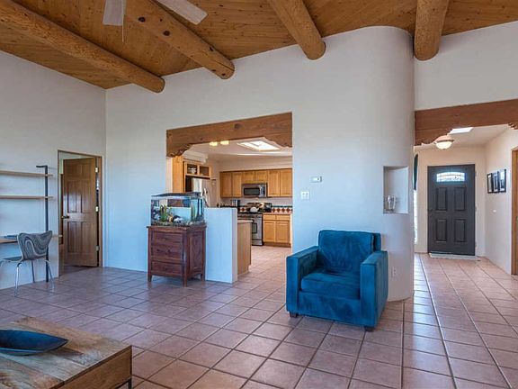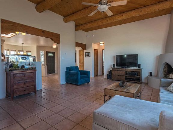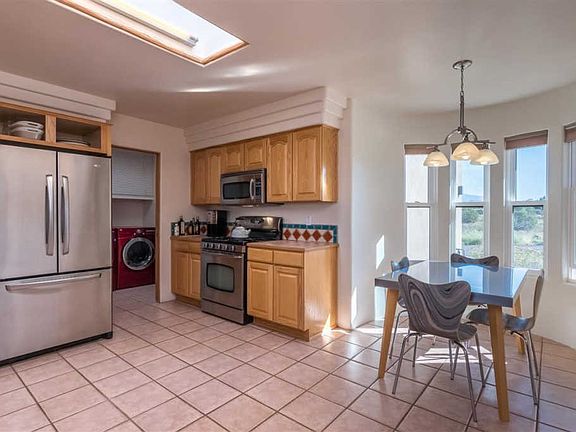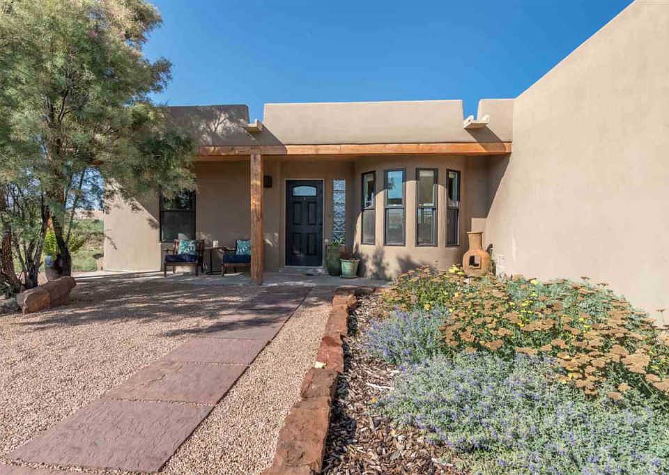 Lovely Single Level home on Green Belt to take in some great Eldorado Views! There is NO Carpet in this easy-care home with split bedroom design, sensible floor plan, multiple Sky Lights, Large Open Kitchen, cozy Kiva Fireplace, Vigas, beams, Nichos, and Sweet Bay Window in the dining area. This home features an Office or Studio with Separate Entrance. There is Value here too! Newer stucco, Pella Windows, Fenced Yard, landscaping, refreshed driveway, More! Eldorado is home to Astonishing Sunsets, Divine Night Skies, Stellar K-8 School, Summer Time Pool, Miles and Miles of Hiking and Bike Paths, Acres of Wilderness Preserve, Library, Senior Center, dining, gym, more, and home to one of the nicest and friendliest communities anywhere! About 20 Minutes to The Santa Fe Plaza. Choice!