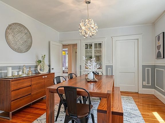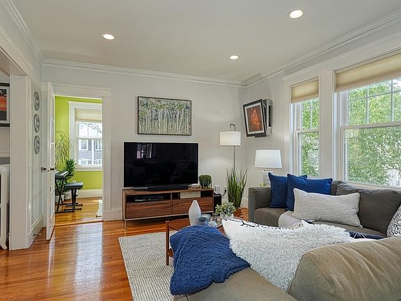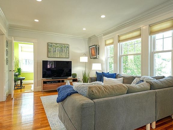 Your wait for great is over. Thoughtfully renovated 3 bedroom condo with solar panels, mini-splits for zone heating/cooling, and on demand hot water. Open plan living and dining room offer ideal flow for entertaining. Convenient sunroom/office is located just off of the living room. Built-in china cabinet & raised panel wainscoting lend function & elegance to the dining room. Updated kitchen features white shaker cabinetry, stainless appliances, recessed lighting, granite counter, pantry for extra storage, and access to the rear staircase and a sweet deck. There are 3 bedrooms, one with staircase to an attic with 8’ 9” center beam, offering potential for expansion. You’ll find gleaming wood floors, high ceilings, & crown molding throughout. Basement is home to the owners’ “office” and laundry area (not included sq ft). Large fenced yard with mature plantings offer wonderful seasonal color. Garage plus driveway parking. Near Town Field, public transp, and terrific shops and restaurants.