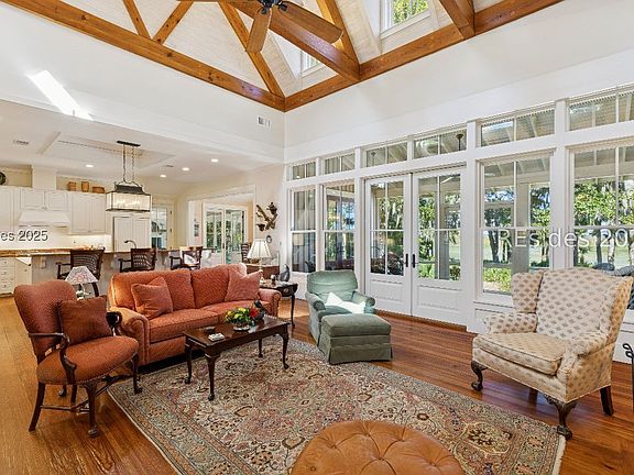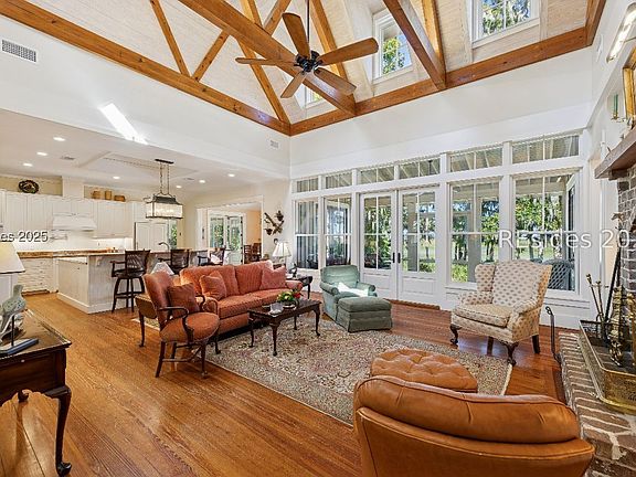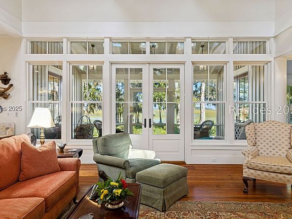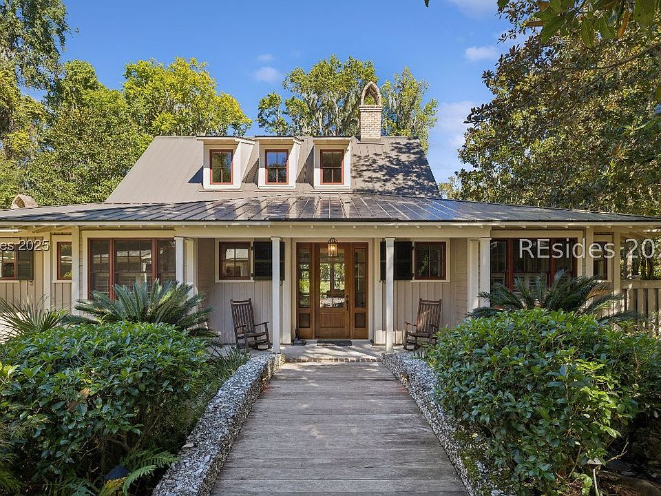 Experience Southern elegance in this beautifully crafted Lowcountry home, ideally situated in the heart of Spring Island. Set on 3.14 acres of pristine marsh front, this extraordinary property offers 4,698 heated square feet of thoughtfully designed living space, blending comfort, privacy, and unmatched natural beauty. Designed by Johnson & Associates, the property features 4 bedrooms and 4.5 bathrooms, with a classic Lowcountry architectural style that includes wide porches, a vaulted ceiling in the living room, pine floors and two working fireplaces that create a warm and inviting atmosphere. The home features large windows that frame panoramic views of the surrounding waterways, flooding the interior with natural light and offering stunning vistas from nearly every room. The landscaping is a showpiece of its own, with mature native plantings and a tranquil water feature welcoming you at the front entry. The beautifully manicured grounds provide a peaceful, park-like setting that enhances the home's sense of serenity and connection to nature. A detached guest cottage offers a private sanctuary for visitors, complete with its own outdoor patio and serene marsh views. The property also includes a spacious two-car garage featuring two bonus rooms, a fully equipped workshop, and an additional guest suite with a full bath above-ideal for a home office, art studio, or in-law suite. This is a rare opportunity to own a true Lowcountry masterpiece-perfectly positioned to enjoy the world-class amenities and natural splendor that make Spring Island one of the South Carolina coast's most coveted communities.