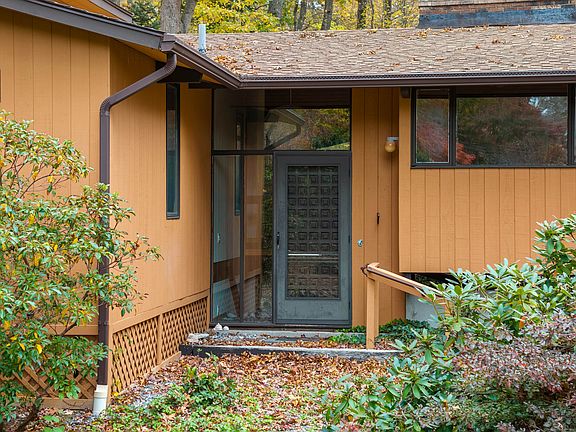Designed by the renowned Acorn Deck House Company, this striking mid-century contemporary blends timeless craftsmanship with modern warmth. Vaulted cedar ceilings, exposed beams, and walls of glass invite nature inside, filling the home with natural light and serenity. The kitchen opens to a glass-enclosed sunroom and a screened porch-ideal for morning coffee or quiet evenings surrounded by trees. A double-sided brick fireplace anchors the open living area, complemented by hardwood floors and a seamless connection to the outdoors. Set against a backdrop of vibrant woodlands, this home embodies architectural character and peaceful living.