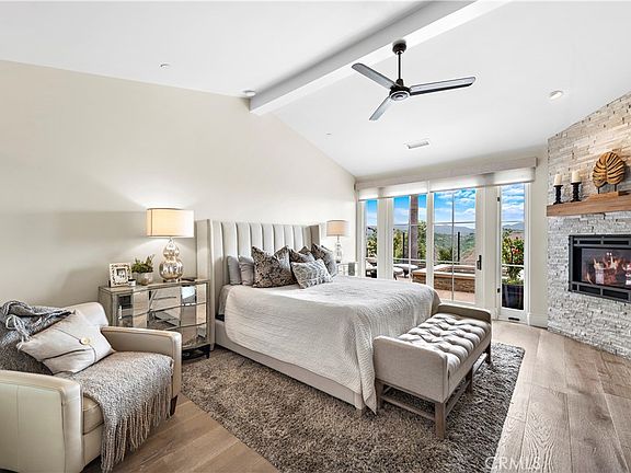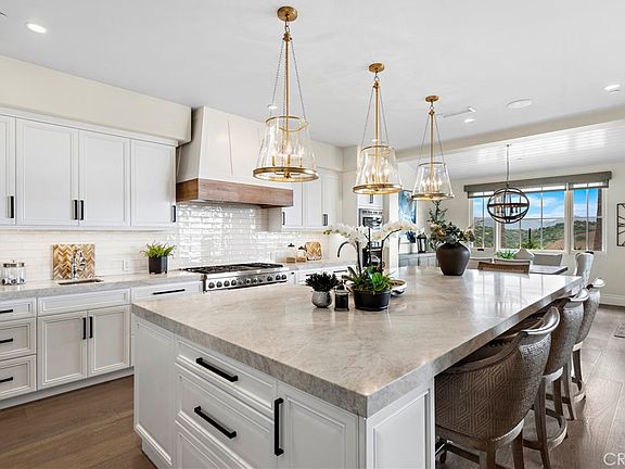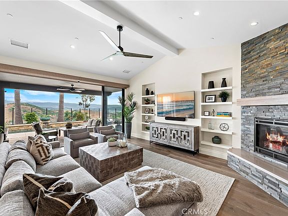 Enjoy the rewarding lifestyle you aspire to at this rare single-level custom estate sequestered on a cul-de-sac behind the guarded entry gates of Covenant Hills at Ladera Ranch. Positioned on a large homesite to take full advantage of its expansive hill and valley views, the distinguished five- bedroom (5th bed has no closet ), four- and one-half-bath residence extends across approximately 4,399 square feet. The open design is virtually single-level, with the single second story room reserved for a versatile loft with deck that can easily become an office, a gym and more. A gated entry courtyard hints at the beauty that awaits beyond the front door, which leads to an impressive foyer, and a family room with fireplace, built- ins, automatic shades, and 9’ sliding glass doors that open to the backyard. A fireplace, built-ins and automatic shades complement the family room, which opens to a stunning fully appointed chef’s kitchen, complete with a massive island, breakfast nook, shiplap ceiling, leathered quartzite countertops, white cabinetry with glass uppers, filtered drinking water, a built-in desk, and Thermador appliances including a built-in refrigerator and a six-burner range with griddle. Offering solar power, e-vehicle charger and whole-house filtered water, the San Juan Rustic residence is gorgeous at every turn thanks to elegant architecture, engineered hardwood flooring in most rooms, tile or carpet in select rooms, custom lighting, custom built-ins, vaulted ceilings, and smooth-coat finished interior and exterior walls. A wine closet and a game room that opens to the backyard are certain to embellish memorable evenings with loved ones. For the ultimate escape, the fireplace-warmed primary suite reveals a handsome fireplace, backyard access, a spacious walk-in closet with built-ins, jetted therapy tub and a separate shower. Experience Southern California’s renowned climate in a private view-enriched backyard that presents a pool, spa, a sunken seating area with open-air fireplace, custom fountains, an outdoor kitchen with BBQ, and raised planter beds for farm-to-table freshness. Award-winning schools serve the neighborhood, and Mission Hills Park, Ladera Ranch trails and the opulent Covenant Hills clubhouse are close to home.