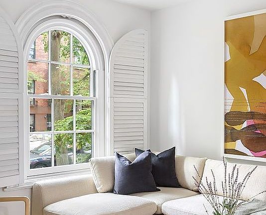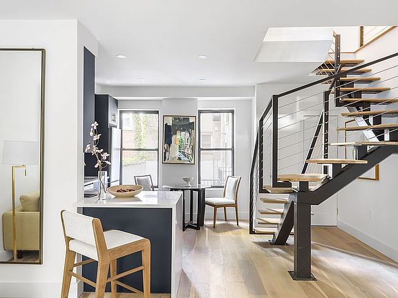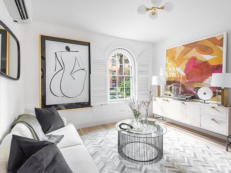 Unit 1 is a townhouse style duplex with three beds, three full baths, and exposures in the front and back. A stunning original radius window looks out onto the beautiful Monroe Place. The primary bath in this unit features large format Carrara marble wall tiles and the most perfect marble herringbone floors.
