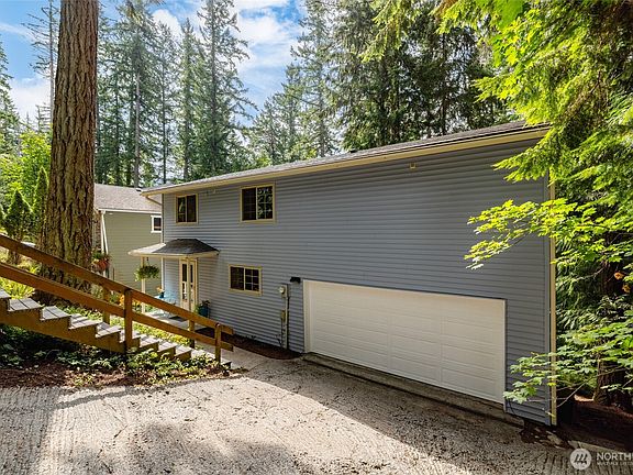 Welcome home to this tastefully updated,affordable home w/flexible living spaces on both floors.Enjoy the main entry w/open concept living room/large kitchen w/eating space,house length synthetic decking overlooking your own private forest.Upstairs leads to another flexible living room space,2 spacious bedrooms w/a shared full bathroom,& the big primary suite,featuring its own full bath & jetted tub.Both bathrooms have new vanities.Updates include a newer roof,laminate flooring,new carpet,interior paint,a cozy warm pellet stove, new decking & railing.Spacious 2 car garage & next door un-buildable green space.Community amenities include parks,trails,swimming pool,golf course,lake acess,beaches and more! Pre Inspected so no surpises too.